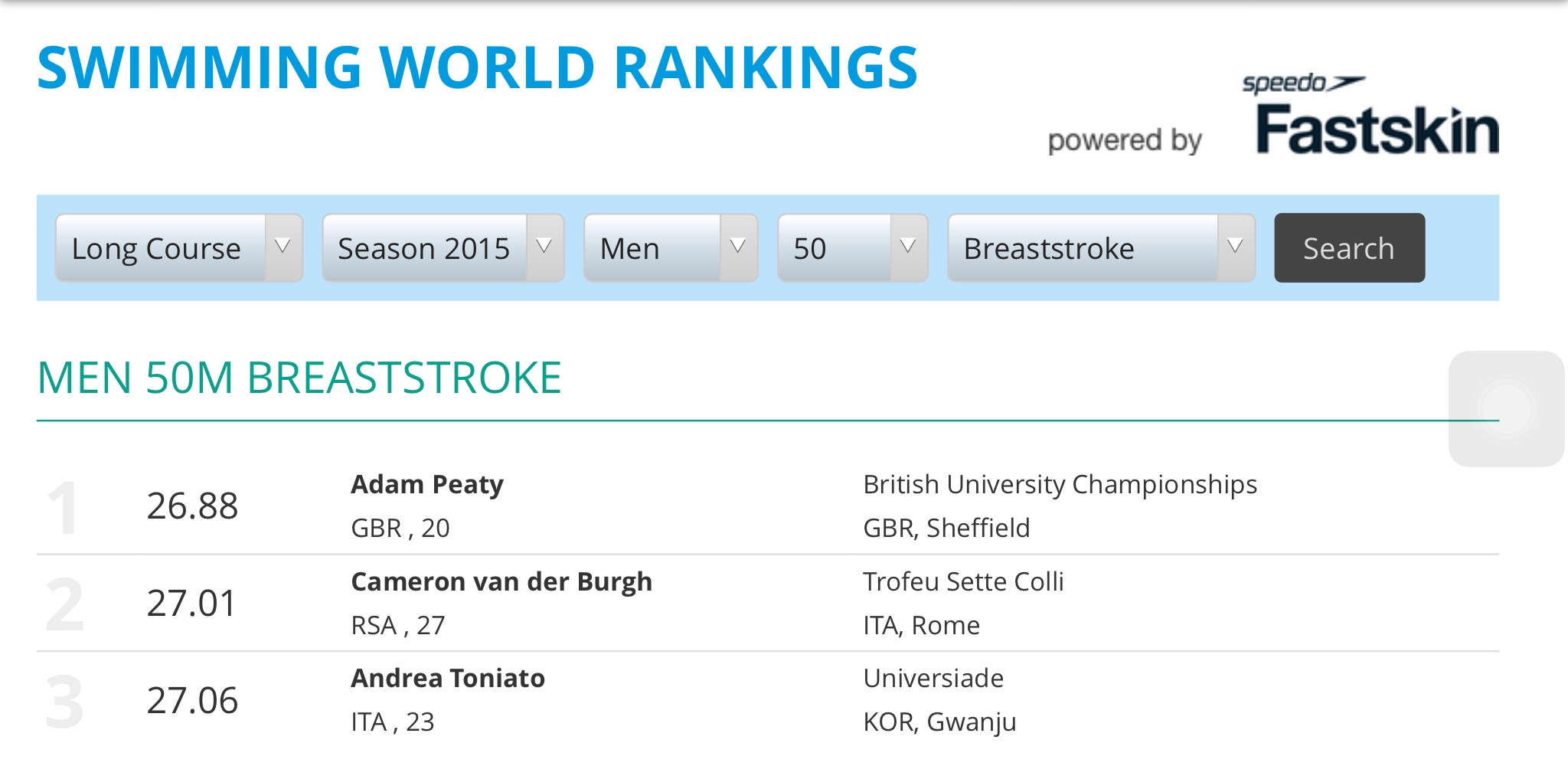 Nelle batterie di qualificazione dei 50 rana alle Universiadi di Gwanjiu Andrea ha siglato il nuovo record italiano assoluto della distanza, ma non basta, è la terza prestazione mondiale stagionale, ad un mese dai mondiali di Kazan e questo tempo è anche il tempo limite per accedervi, quindi?