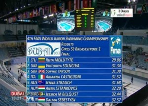 Grazie al suo 31.54, infatti, siglato già nei preliminari, Arianna si è confermata ai vertici assoluti della rana azzurra. Solo un imprevisto nella semifinale a Dubai stava per complicare tutto: un contrattempo tecnico, il giudice di partenza che blocca la sua batteria dopo i tre fischi e fa nuovamente sedere le atlete, mandando Arianna completamente nel pallone: “In acqua stasera non ero io” ha riferito Arianna al suo coach, “mi sono innervosita e ho nuotato male, non prendevo acqua!”. Meno male che questo non le è costato la finale: 31.85 e l’ultimo posto disponibile. Si sapeva che valeva di più e per questo ci si aspettava una grande reazione nella finale.