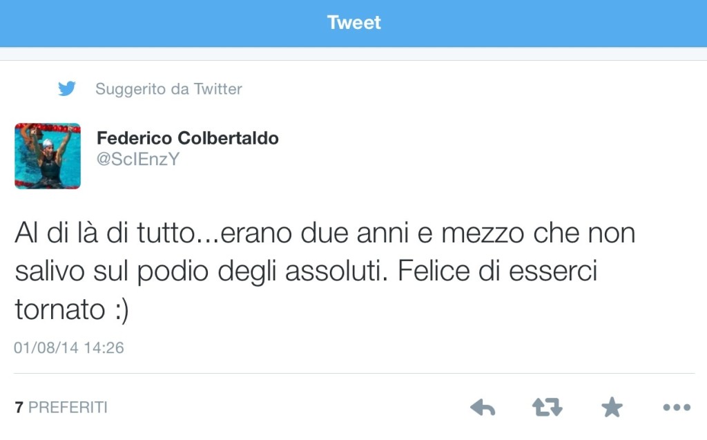 Quel Federico allenato dal maestro Bane Dinic a Montebelluna che ci ha regalato emozioni a go go negli anni d’oro in cui stravinceva nelle distanze lunghe in Italia e non solo, lui primatista europeo degli 800 che ha ceduto tale record solo ad aprile sotto le bracciate di Gabriele Detti e Gregorio Paltrinieri, lui, il mitico Federico Colbertaldo!