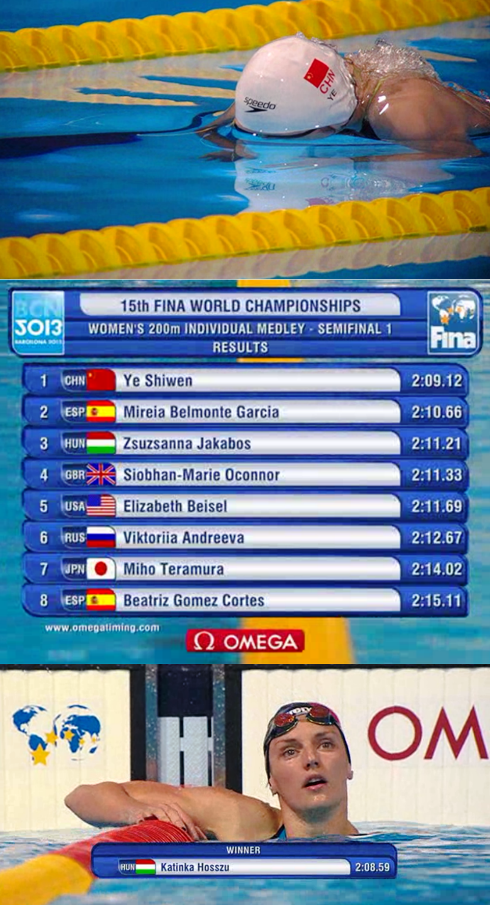 Nei 200 misti donne c’è stato il botta e risposta tra la cinese Ye e l’ungherese Hosszu, nella prima semifinale la cinesina primatista mondiale dei 400 misti e campionessa olimpica nella stessa gara ma anche nei 200 ha dominato la prima serie nuotando 2.09.10 e facendo pensare ad un altro dominio asiatico, così non è stato però perche Katinka che quest’anno ha svolto una preparazione incredibile nuotando in ogni tipo di gara sia in vasca che fuori nella seconda serie è andata sotto il 2.09. ovvero 2.08.59, in finale sarà bellissimo vederle prendersi a sportellate!