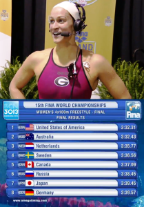 Con questo cognome avremo voluto averla tra le italiane, ma non perchè le nostre non siano valide, anzi, pur non entrando in finale le nostre 4 hanno fatto il record italiano in qualificazione! ma perchè la signorina Megan Romano ha nuotato solo 52.60 in ultima frazione raggiungendo e superando negli ultimi tre metri l’australiana Coutts che vistasi superare ha versato lacrime di dispiacere all’arrivo, triste ma bellissima nella sua reazione come belle le compagne nel consolarla, vittoria agli stati uniti.