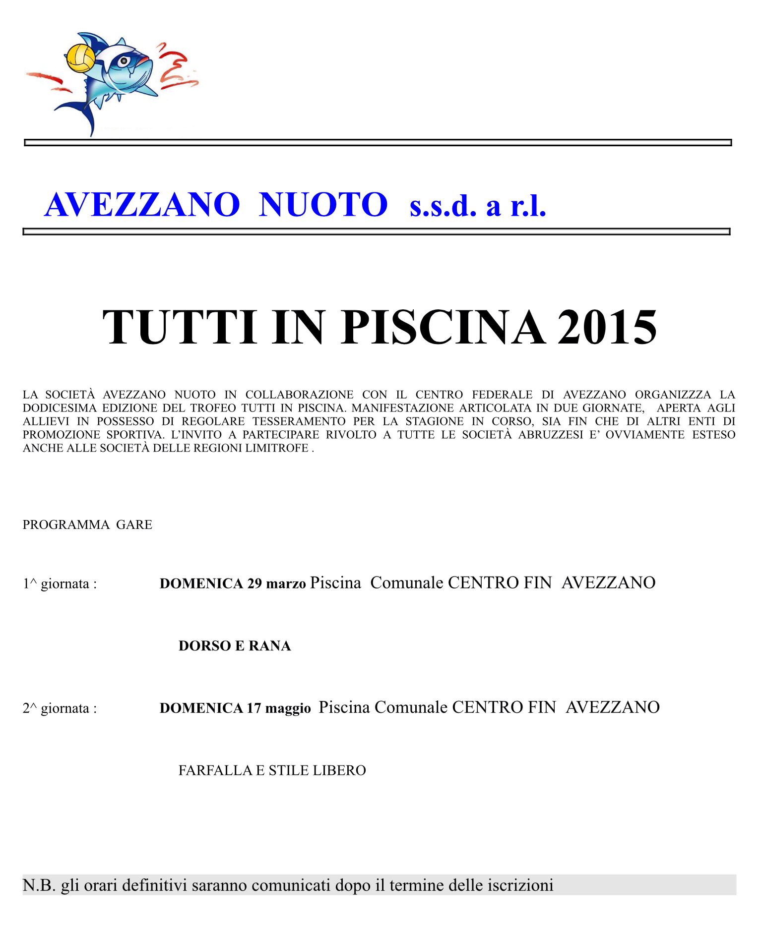 LA SOCIETÀ AVEZZANO NUOTO IN COLLABORAZIONE CON IL CENTRO FEDERALE DI AVEZZANO ORGANIZZZA LA DODICESIMA EDIZIONE DEL TROFEO “TUTTI IN PISCINA”.