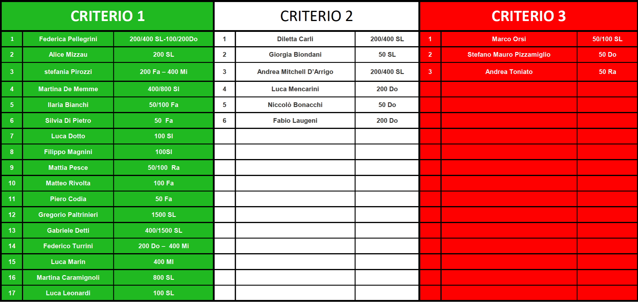 - Gli atleti inseriti nella precedente stagione (12/13) e in quella che sta iniziando (13/14) nel Progetto Rio a condizione che abbiano ottenuto durante i campionati italiani di categoria estivi a Roma o durante i campionati mondiali juniores di Dubai dei tempi uguali o migliori del 16° dei mondiali di Barcellona.