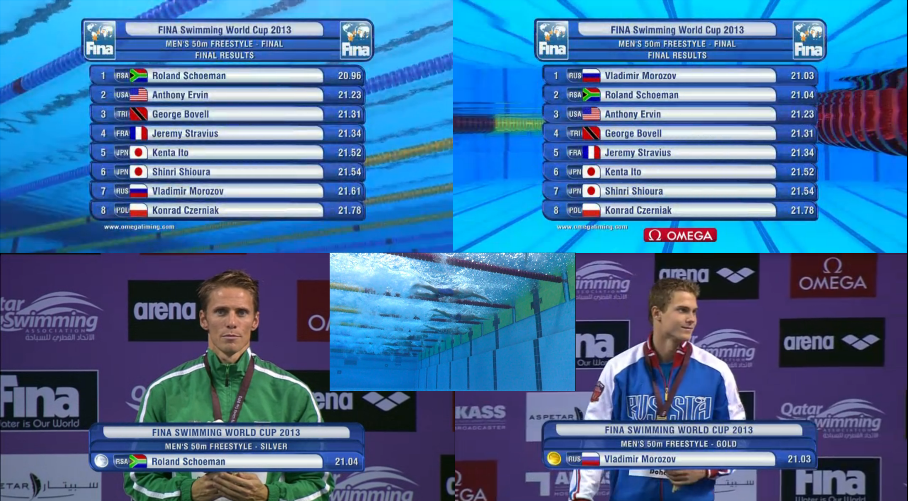 Infatti poco dopo arriva il verdetto corretto, primo Morozov in 21.03 secondo Schoeman in 21.04 (anche se il distacco sembrava superiore) e terzo Anthony Ervin in 21.23