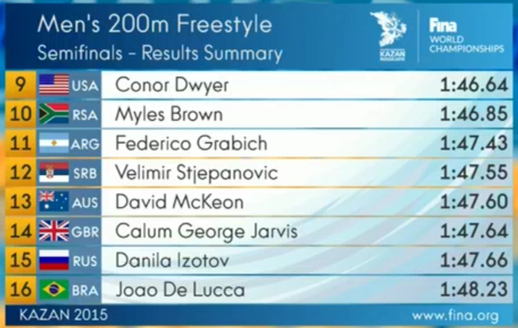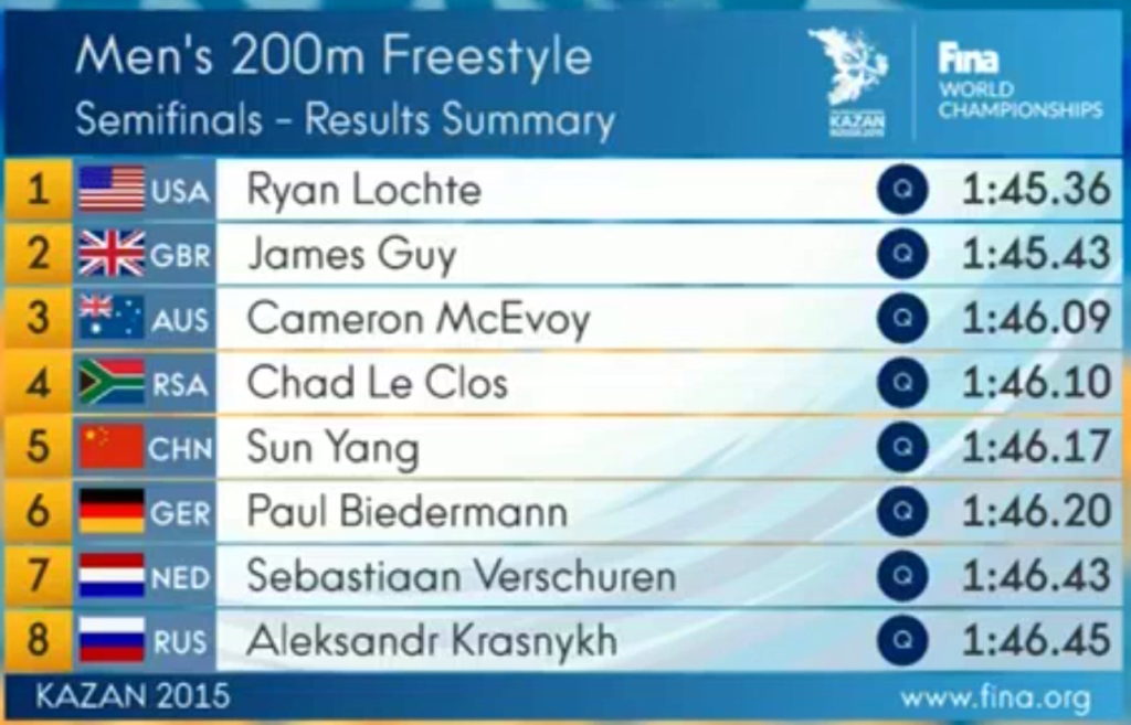 Dalle retrovie in corsia laterale Ryan Lochte vola in prima posizione in 1.45.36 davanti a James Agus in 1.45.43! Sara una finale interessante con Sun ma anche Le Clos!