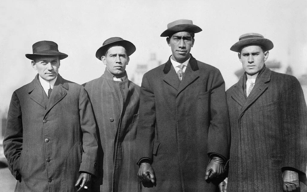 I soldi per il viaggio, circa 1000 dollari, furono trovati attraverso sottoscrizioni popolari, una festa danzante e gare atletiche da Bill Rawlins, il mentore della squadra. La partenza fu tutt’altro che facile: Duke a 22 anni, non era mai uscito dalle sue isole e non aveva mai gareggiato in una piscine, tantomeno coperta. (nella foto Zen Genovese, Lew Handerson, Duke Kahanamoku e Dude Miller in partenza per quel viaggio della speranza).