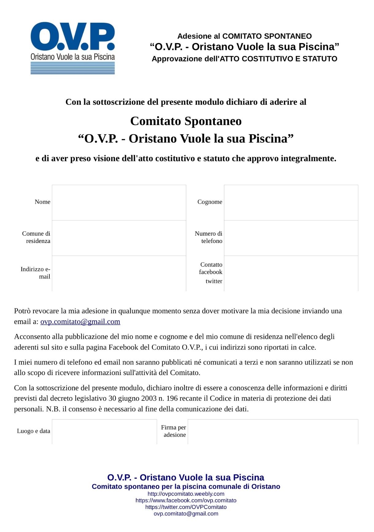 Il comitato OVP chiede sostegno, niente soldi, niente impegni, niente di niente se non l’adesione al progetto con la compilazione di un modulo che non ha nessun obbligo e che può essere revocato in qualsiasi momento, in pratica aderendo al comitato lo si rende più numeroso facendo salire così la “richiesta” di riapertura della piscina.