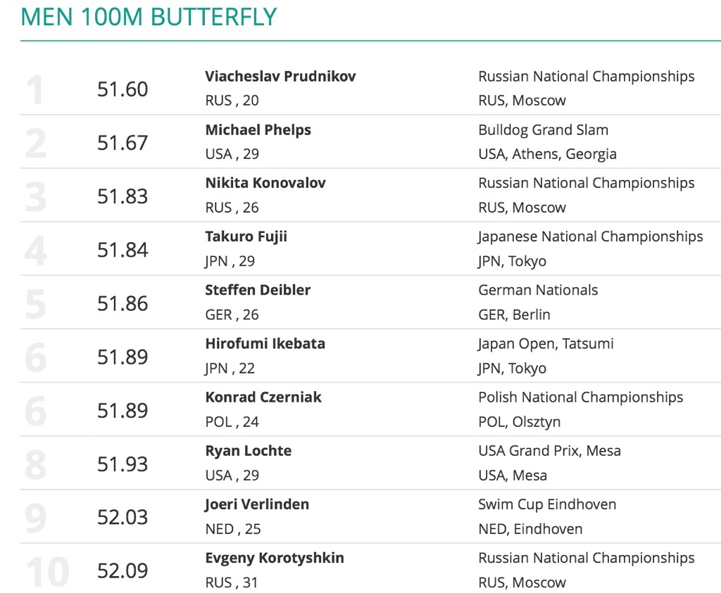È successo ieri, in Georgia durante la seconda giornata del Bulldog grand Slam ad Athens, Michael Phelps ha siglato il secondo crono mondiale stagionale (51.67) dietro di soli 7 centesimi al russo Viacheslav Prudnikov primo (51.60).