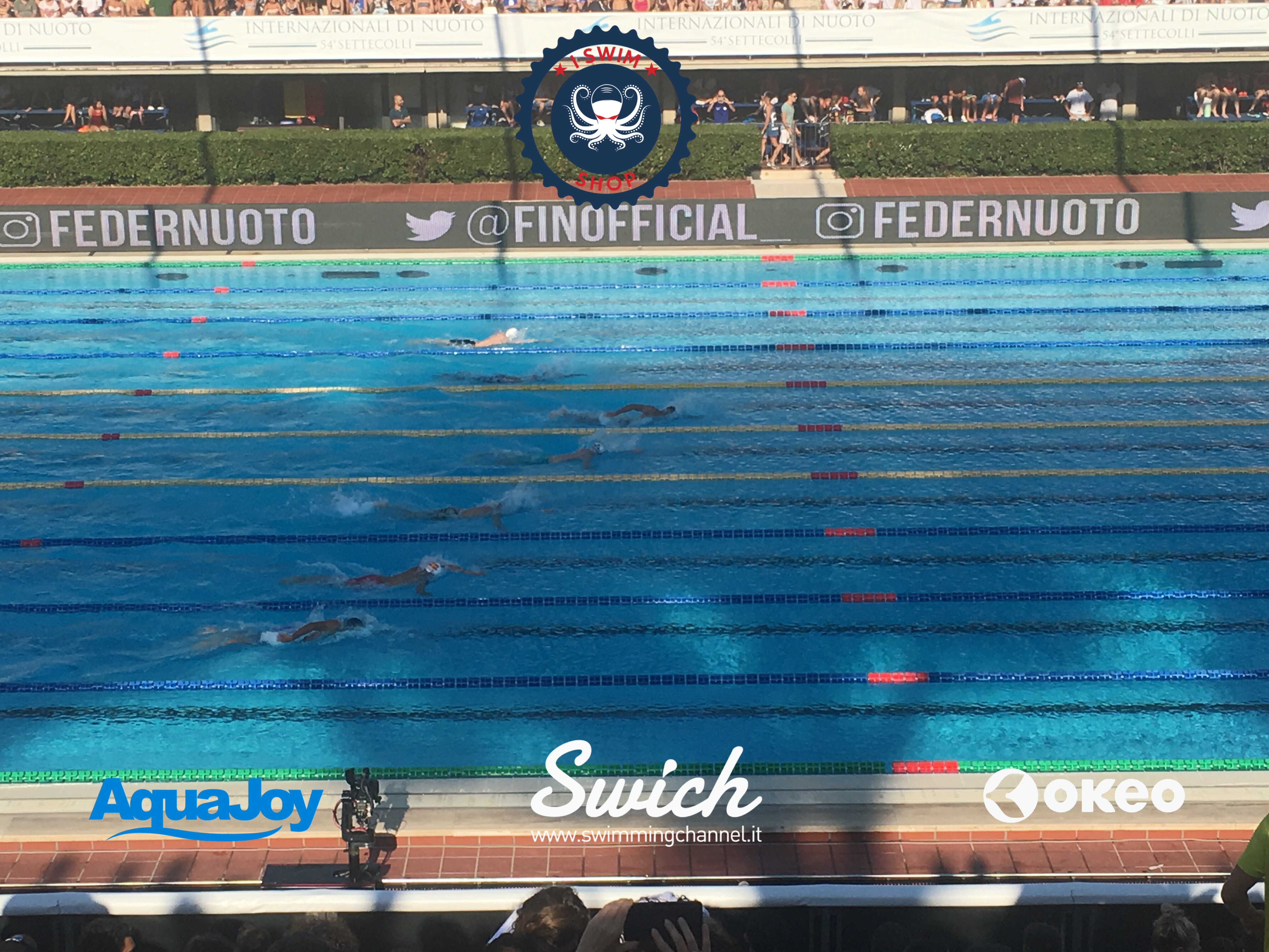 56.02, inizia così il 1500 di Gregorio Paltrinieri che mette le cose in chiaro da subito si come vuole far andare la gara, assente Gabriele Detti per febbre l’unico avversario che può impensierirlo è l’australiano Mack Horton che con un ritmo di bracciata lento ma basta per seguire Gregorio da vicino, 1.55.41 – 2.54.83 – 3.54.44, ai 400 metri solo 1 metro e mezzo separa i due campioni olimpici e in terza posizione il ceco Micka segue due metri dietro. Il vantaggio di Gregorio cresce sensibilmente ai 600 metri ma la gara è ancora aperta, tuttavia vista l’accoglienza del pubblico romano la voglia di vincere è irrefrenabile!