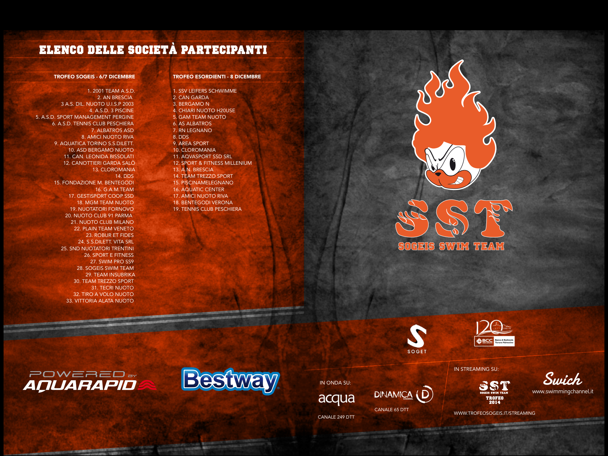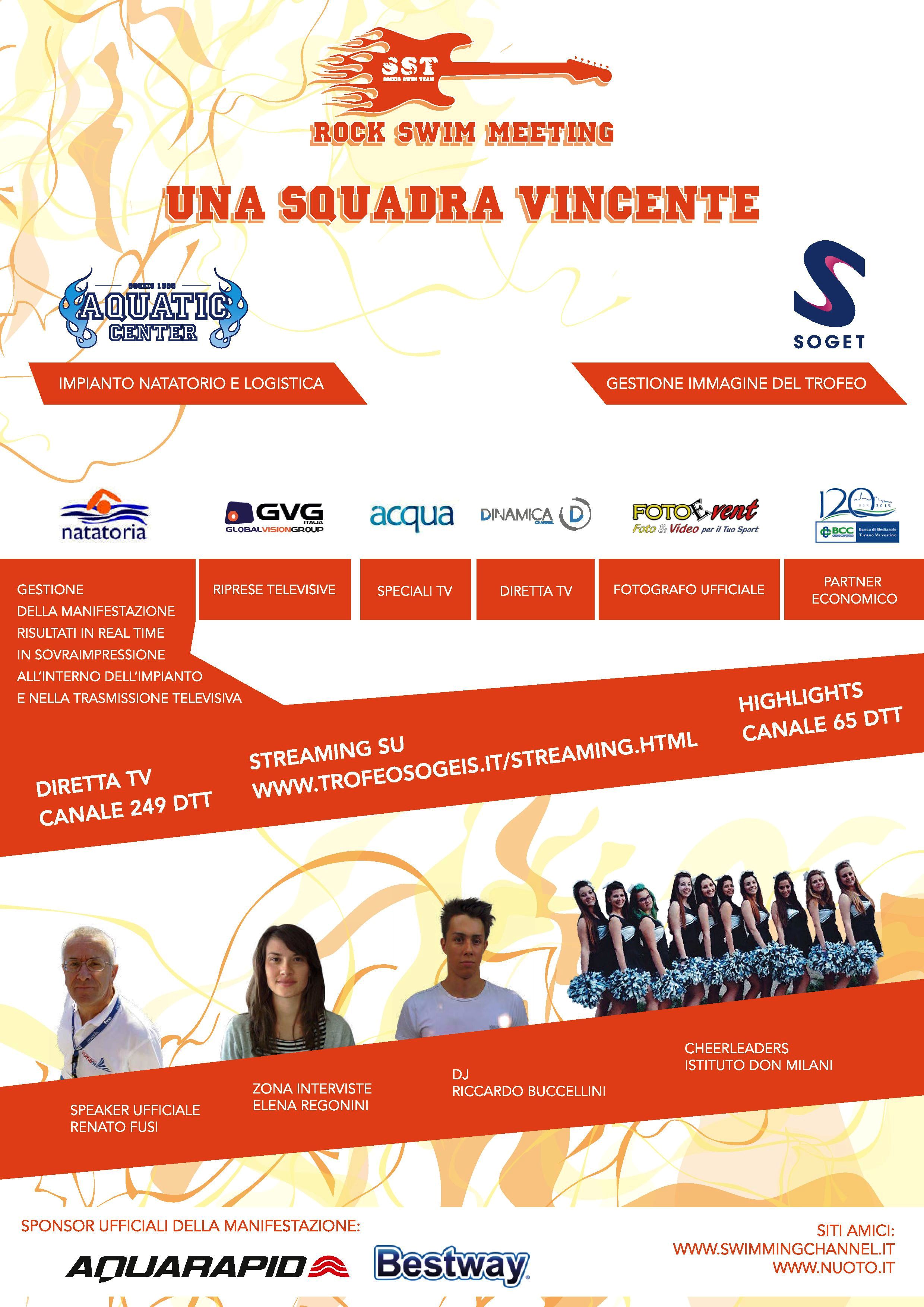 In streaming per tutta la gara anche su SWIMMINGCHANNEL.IT e all’indirizzo http://www.trofeosogeis.it/streaming.html , su dinamica channel tutta la gara in diretta sul canale 249 del digitale terrestre, acqua gliu highlights della manifestazione e tutte le interviste sul canale 65 del digitale terrestre.