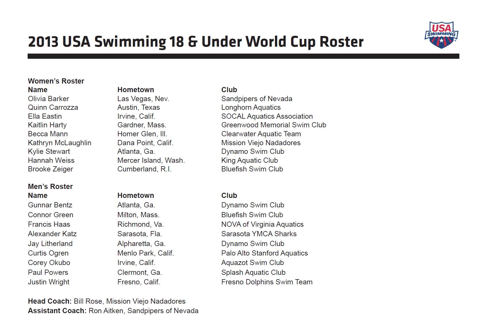Per la federazione americana la coppa del mondo è uno step fondamentale per permettere ai giovani di fare esperienza e traghettarli dal mondo juniores a quello assoluto, la stessa Missy Franklin ha esordito nel 2011 in un meeting internazionale assoluto proprio con le gare di coppa del mondo.